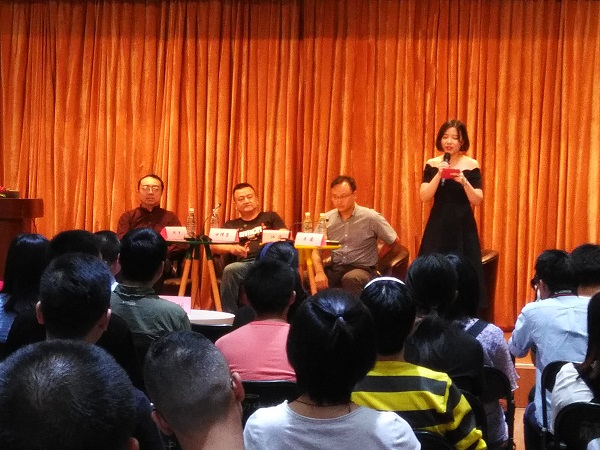 开场前,为了活跃气氛,主持人吴霜用她自己近二十年的科幻迷和科幻作家的身份与在场的同学进行了互动,交流了对“硬科幻”与“软科幻”的理解。讲座开始后,两位科幻作家分别介绍了自己的代表作,使一些没有接触过这些作品的同学能够对两位作家的作品有一定的感性认识。随后,甘伟康谈起与两位作家的相识渊源,他表示,《天年》与《银河之心》这两本书是目前为数不多的精彩、深刻而又围绕人性的科幻作品。三位嘉宾在交流时,甘伟康先生对两位作家提出的一个问题也让在座的同学们非常关心:何夕与江波先生的本职工作并不是作家,但要完成几十万字的书稿却是要呕心沥血的,是什么能够让他们在工作之余去坚持写完这些作品呢?两位作家的答案非常统一:那就是对科幻从心底的热爱。何夕先生说:“我只是赋予了我笔下人物的一些基本性格特征,不是我去推动故事发展,而是他们的人物特征会推动着我去‘记录’他们做出的每一个决定,我只是充当了一个记录者。”