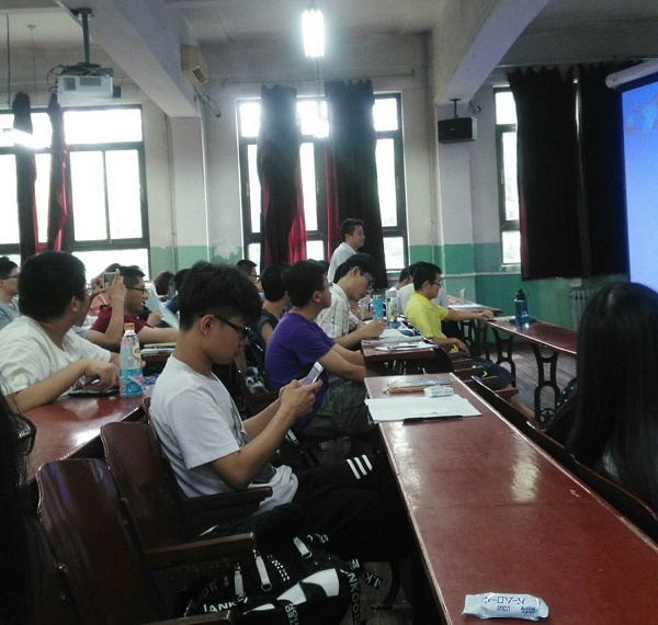 在整个交流过程中,黄海教授就智能结构以及控制的发展状况向同学们进行了介绍。黄海教授平易近人,十分详细的向同学们介绍了六杆减震平台的工作原理,并向同学们展示了减震平台的效果,激发了同学们对于结构的控制以及利用到的新材料的兴趣和学习热情。